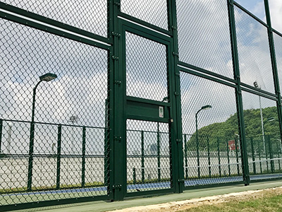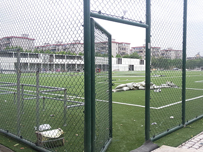 選用低碳鋼絲。 編織方法: 編織焊接而成。 規格: 1. 包塑絲經:3.8mm ; 2. 網孔:50mm X 50mm; 3. 尺寸:3000mm X 4000mm; 4. 立柱:60/2.5mm; 5. 橫柱:48/2mm; 防腐處理: 電鍍、熱鍍、噴塑、浸塑處。 優點: 具有防腐、防老化、抗曬、耐候、色彩鮮亮、網面平整,強有力張緊,不易受外力撞擊變形、現場施工安裝、靈活性強(可根據現場要求隨時調整造型和尺寸)。 可選顏色: 藍色、綠色、黃色、白色等